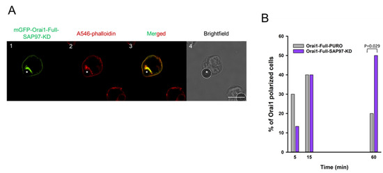 Thereafter, the kinetics of Orai1-accumulation was determined by creating IS between Jurkat cells expressing mGFP-Orai1-Full channels with reduced SAP97 expression, and CD3-CD28 antibody coated beads (Figure 7A, for mGFP-Orai1-Full-PURO control see Figure 3B). In SAP97 knocked-down cells the percent of Orai1-polarized cells at the 60th minute (Figure 7B, p = 0.029) was higher as compared to the control. This means that the redistribution kinetics is similar to the mGFP-Orai1-Full-STIM1-KD and mGFP-Orai1-Δ72 expressing cells (Figure 3C and Figure 5B) (AR value for Orai1 also showed significant difference between mGFP-Orai1-Full-SAP97-KD and mGFP-Orai1-Full-PURO control cells at 60th minute, p < 0.001, see Figure S6).