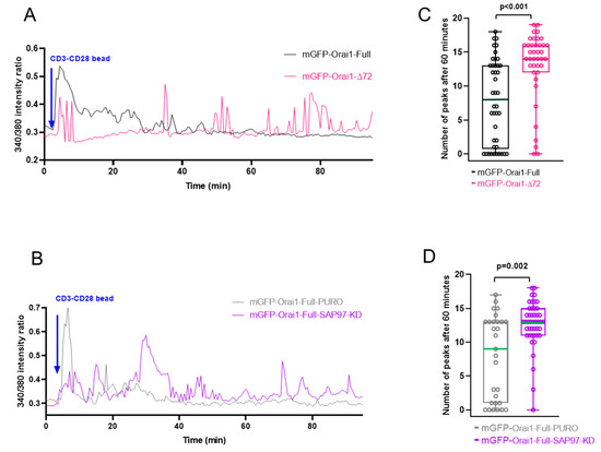 Moreover, the time-course of Ca2+ response was altered: while control cells (mGFP-Orai1-Full, mGFP-Orai1-Full-PURO) usually had a main peak right after the bead conjugation, which subsided over time, in mGFP-Orai1-∆72 and mGFP-Orai1-Full-SAP97-KD cells several Ca2+ peaks was observed during first 60 min of IS and even after the 60th minute (Figure 8A,B).