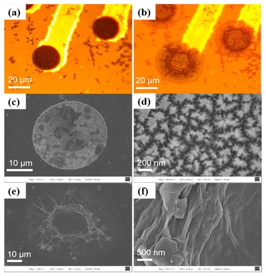 The morphology of the modified microelectrodes was observed by optical microscopy and scanning electron microscopy (SEM). As can be seen in Figure 1a, the optical micrograph shows PBK deposited on the bare gold microelectrodes tightly and uniformly without cracks. Furthermore, the SEM pictures in Figure 1c,d show that the PBK has many cauliflower-shape nanoparticles with dimensions of several hundred nanometers. These nanoparticles gave the PBK a large specific surface area, which could enhance the binding force with PGO. An optical micrograph of the PBK/PGO modified microelectrodes is shown in Figure 1b. As can be seen, the PGO was deposited on PBK evenly and tightly without delamination. Furthermore, the SEM pictures in Figure 1e,f show the electrodeposited PBK/PGO has a folded microstructure with large specific surface area, which helps to increase double layer capacitance.