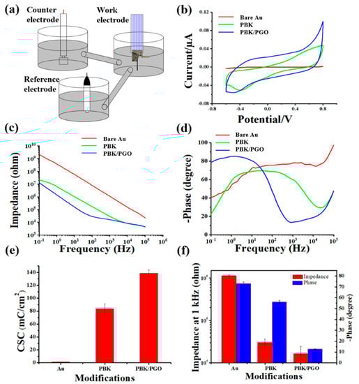 (a) Three-electrode system, (b) averaged cyclic voltammetry curves, (c) electrochemical impedance spectra, and (d) phase curves of unmodified, PBK modified, and PBK/PGO modified microelectrodes (n = 3). (e) Histogram of CSC of microelectrode before and after modification. (f) Histogram of impedance and phase at 1 kHz of microelectrode before and after modification.