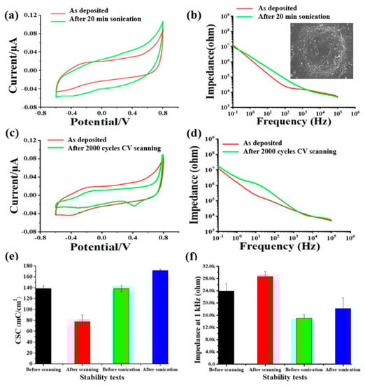 The mechanical stability of PBK/PGO was measured by applying ultrasonic agitation and CV scanning on the modified microelectrode. Firstly, the PBK/PGO modified microelectrode was immersed into PBS, where an ultrasonic agitation was applied with a power of 240 W to simulate the micromotion of brain tissue. After 20 min of ultrasonic agitation, the probe was removed from the PBS to measure the CV and EIS. As shown in Figure 3a,b,e,f, the averaged CSC value increased by 24.1%, and the averaged impedance at 1 kHz increased by 20.8% after ultrasonic agitation (n = 3). The corresponding SEM pictures of one modified microelectrode after sonication in Figure 3b reveal that the PBK/PGO was stable without delamination during sonication. The CV was scanned from −0.6 V to 0.8 V with a scanning rate of 1 V/s to study the electrochemical stability of PBK/PGO. After 2000 cycles of scanning, CV and EIS were measured as depicted in Figure 3c,d. As shown in Figure 3e,f, the calculated CSC exhibited a 43.8% decrement, and the impedance at 1 kHz showed a 20.1% increment after CV scanning (n = 3). Obviously, the CSC of the modified microelectrode decreased significantly after CV scanning, which was because the ultrasonic power used in the test was much greater than that used in the previous works. The changes in CSC and impedance after ultrasonic agitation and CV scanning demonstrate that the deposited PBK/PGO on microelectrode has adequate mechanical and electrochemical stability.