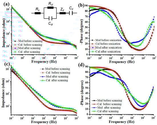 The measured and calculated impedance (a) and phase (b) spectra before and after 20 min sonication. The inset shows the fitting equivalent circuit. The measured and calculated impedance (c) and phase (d) spectra before and after 2000 cycles of CV scanning.