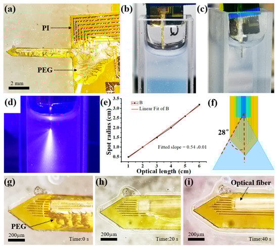 In order to improve the measurement accuracy, the spot radius R at different distances L was measured and fitted as shown in Figure 5e. After calculation, the was equal to 28°. The laser beam model of a fiber on the PI probe is illustrated in Figure 5f. Obviously, the divergent laser beam was sufficient to illuminate all the microelectrode sites when the distance L from the optical fiber to the microelectrode was about 200 µm. To test the degradation rate of PEG in vivo, the encapsulated neural probe was inserted into PBS solution to simulate the implantation process in tissue fluid. Figure 5g–i show the optical micrographs of the PEG on the tip of optical fiber before and after immersion in PBS solution. As can be seen, the PEG dissolved quickly after soaking in PBS for 40 s. Therefore, this design ensures that the neural probe recovers flexibility immediately after implantation, thus reducing the inflammatory response of the tissue.