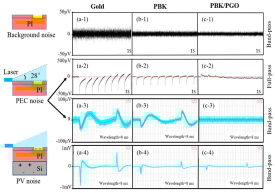 The recorded waveforms of background noise, PEC noise, and PV noise are presented in Figure 6. As shown in Figure 6(a-1,b-1,c-1), the averaged amplitude of the background noise decreased from 9.0 ± 1.4 μV to 7.0 ± 0.9 μV after PBK modification, and then to 5.0 ± 1.6 μV after PBK/PGO modification, suggesting that background noise decreases with the decline in electrode impedance. The photoelectric artifact of the probe was mainly composed of two parts: one originated from the PV effect of the silicon substrate, and another originated from the PEC effect of the microelectrode. Due to the lack of silicon substrate required for the PV effect, the photoelectric artifact of the PI-based probe could have originated only from the PEC effect. As can be seen in Figure 6(a-2,b-2,c-2), the all-pass PEC artifacts of gold and PBK modified microelectrodes from the PI-based probe both had V-shaped waveforms when the light pulses were turning on. However, the PEC artifacts of PBK/PGO modified microelectrodes had an “inverted-v” (or “^”)-shaped waveform. The polarity of the two waveforms was opposite because the PEC of gold/PBK (metal) led to the accumulation of electrons, whereas the PEC of PGO (conductive polymer) led to the accumulation of holes. A similar “^”-shaped waveform originated from the PEC effect of PEDOT has been described in reference []. After calculation, the average amplitude of the all-pass PEC noise dropped from 316.0 ± 69.9 µV for unmodified microelectrode to 215.0 ± 40.7 μV for PBK-modified microelectrode and 26.0 ± 5.8 µV for PBK/PGO modified microelectrode, respectively. Meanwhile, as depicted in Figure 6(a-3,b-3,c-3), the averaged amplitude of the band-pass PEC noise dropped from 38.0 ± 4.9 µV to 28.0 ± 4.6 µV and submerged with the background noise accordingly. The results show that the PEC noise of the PI-based probes could be significantly reduced after PBK/PGO modification. This was because the band gap of PGO was larger than the photon energy emitted by the blue laser, which prevented most photons from being absorbed by PGO, thus weakening the PEC effect. In addition, the PEC noise had little influence on the high-frequency neuron action potential, but significant influence on the low-frequency local field potential.