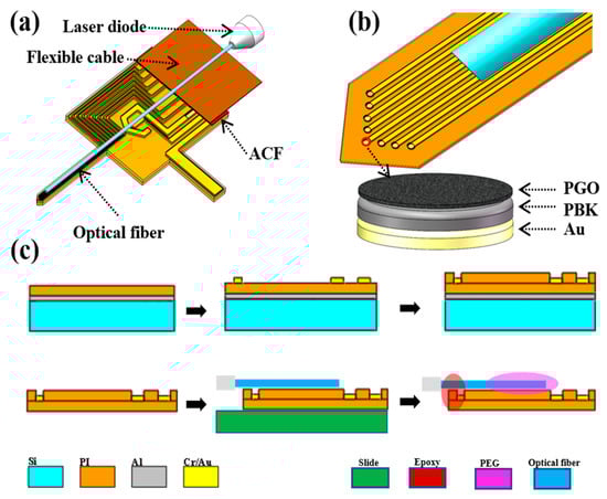 The structure of the integrated probe, depicted in Figure 7a, was composed of a flexible PI-based probe, an optical fiber, and a flexible conductive cable. The flexible neural probe was prepared by micromachining techniques, and the encapsulation material was polyimide. As shown in Figure 7b, the probe has a shank with a length of 5 mm, a width of 420 μm, and a thickness of 53 μm. A total of eight microelectrodes with a diameter of 25 μm and a pitch of 70 μm were arranged on the tip of the shank in the shape of an arrow. The microelectrodes were modified with PBK/PGO double layer to improve the sensitivity and resolution of the probe. The signal transmission between the flexible neural probe and the cable was realized by ACF based hot-press bonding []. An optical fiber with cladding/core diameter of 260/105 µm was attached to the surface of the flexible PI probe, and the distance between the recording microelectrodes and the optical fiber was about 0.2 mm. The flexible probe and the optical fiber were fixed together using polyethylene glycol (PEG) as adhesive. The PEG can degrade in tissue fluid after implantation, allowing the PI-based probe to regain its flexibility. Therefore, this design allows the probe to be rigid enough to pierce brain tissue during implantation and flexible enough to reduce mechanical mismatches after implantation.