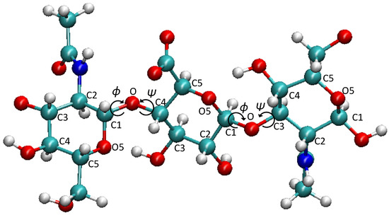 Between the C1 atom of the starting residue (right residue in Figure 2) and the C4 atom of the terminal residue (left residue in Figure 2), to characterize the torsional motions of the GAG chains, we calculated the dihedral angles and across the glycosidic linkage bonds. Their definitions are shown in Figure 2; the angle is defined by O5-C1-O4-C4 and is directly equivalent to the O5-C1-O4-C4 convention of the International Union of Pure and Applied Chemistry (IUPAC). In the case of the , our force field lettering is C1-O4-C4-C3, which equals the C1-O4-C4-C3 definition of the IUPAC. The only difference is the omission of the prime on atoms O5 and C1 [72].