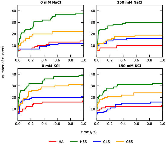 Evolution of the number of conformational clusters at RMSDcutoff = 0.4 nm for the different GAGs (see the color key at the bottom) at the 0 mM (left) and 150 mM (right) salt concentrations (see the label above each panel).