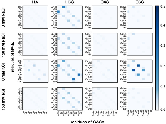 Intramolecular contacts among the residues of the GAGs at 0 mM NaCl, 150 mM NaCl, 0 mM KCl, and 150 mM KCl concentrations (labels left of each panel). The residues of the GAGs are abbreviated with the following codes: GU (GlcUA), GlN (GlcNAc in HA), GlN (GlcNAc(6S) in H6S), GaN4 (GalNAc(4S)), and GaN6 (GalNAc(6S)). The color code on the right represents the probability of a contact among residues during the MD simulations. For the sake of clarity, the diagonal and first off-diagonal elements of the contact maps corresponding to self-contacts within the same disaccharide unit are not shown.