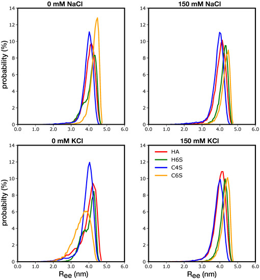 The values observed here were in good agreement with the values previously reported for larger GAGs. For instance, Bakker and coworkers simulated HA with eight disaccharide units and obtained a time-averaged end-to-end distance of 0.7 nm, while the contour length was reported as 0.8 nm [30]. These lengths are roughly eight-/five-times those (resulting from eight versus five disaccharide units) that we recorded. Guvench and coworkers studied various sulphated and nonsulphated GAGs with either five or ten disaccharide units (called 10-mers and 20-mers, respectively) and found very similar distributions for the 10-mers [27,28] and distributions peaking at about 0.8 nm in the case of the 20-mers [28,29]. The values were thus roughly doubled when increasing the GAG length from five to ten disaccharide units; however, the distribution became clearly broader toward smaller end-to-end distances with increasing GAG chain length. This indicated that the flexibility of the GAGs increased with their size, an influence that was not studied here.