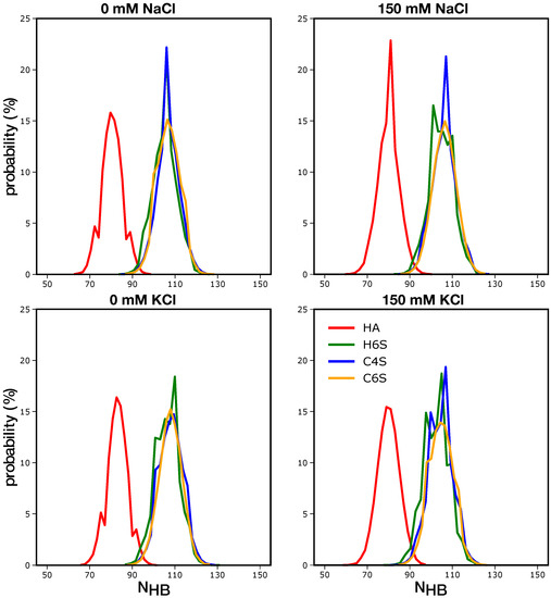 To characterize the GAG–water interactions, we calculated the number of hydrogen bonds (H-bonds) formed between GAGs and solvent molecules. In Figure 6, it can be observed that irrespective of the salt concentrations, HA formed the least number of such H-bonds. This can be easily explained with the presence of the sulphate (OSO) group in the other three GAGs. A comparison between the H-bond numbers revealed that H6S, C4S, and C6S tended to build 20–30 H-bonds more with the surrounding water molecules than did HA. Since there are five OSO in each of H6S, C4S, and C6S, one can estimate that each sulphate group gives rise to about 4–5 H-bonds. This is probably slightly overestimated since H-bonds calculated were identified on geometric grounds only. Yet, the picture presented serves the purpose to demonstrate the significant effect that OSO has on GAGs’ binding of water molecules. The H-bond distributions of H6S, C4S, and C6S were very similar, and the GAG–water interactions did not help to explain the structural characteristics of the different GAGs.
