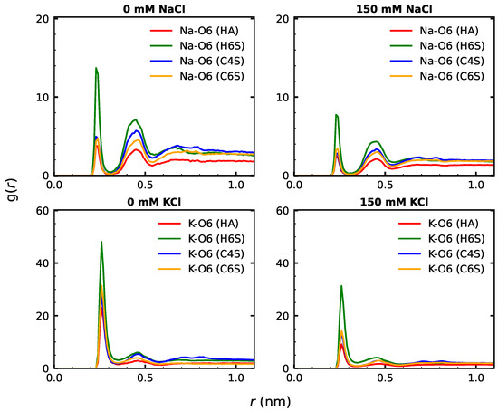 The second difference between the different systems is that the carboxylate group interacted more strongly with either cation than the sulphate group did; this agrees well with previous findings [26,29,59]. Finally, in the absence of Cl ions, i.e., in the 0 mM KCl and NaCl systems, the interactions between either cation and either of COO and OSO appeared stronger than in the presence of Cl ions (i.e., in the 150 mM KCl and NaCl systems). This conclusion can, however, not be drawn from the heights of the RDF peaks, which were smaller in the 150 mM systems. However, it should be considered that the RDF was normalized with respect to the density of the cation in question, which was obviously higher in the 150 mM systems. Therefore, a comparison of the RDF peak heights at different salt concentrations might be misleading. When assessing the number of cations in the GAGs’ vicinity, Figure S9 shows that this number was higher in the 150 mM systems. However, it did not increase by a factor of four (or seven) when the number of cations was being increased from ten to forty (or from five to thirty-five in the case of HA), but only by about two to three. Therefore, the conclusion was that in the absence of Cl, the relative attraction between the GAGs and the cations was stronger.