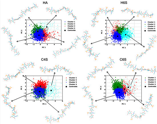 As we studied the behavior of GAGs with a wide variety of calculated structural observables, we now present an approach to disentangle the conformational states by a free energy method. We started by concatenating four of the previously introduced features, namely for and , , and , into one state vector, which represents the structural evolution of the GAGs. As an example, the projection of all MD snapshots sampled for the GAGs at 150 mM NaCl is shown in Figure S11. A PCA was applied to this state vector, and the first two principal components (PCs) were chosen for calculating the free energy according to Equation (2). The resulting free energy surfaces for the 150 mM NaCl systems (Figure S12) revealed one main energy basin for each GAG. The width of these basins was somewhat larger for C6S and H6S, which is in agreement with their increased flexibility identified by the clustering analysis (Figure 3). The corresponding projection of all MD snapshots onto the first two PCs can be seen in Figure 8. In order to identify representative structures, we performed a k-means clustering of the structures. To decide on the numbers of clusters (k) to consider, we plotted the inertias for increasing k (Figure S13) and applied the elbow method to it. From this, we disclosed that four clusters were sufficient in segregating the conformational space, since for , the inertias reduced only mildly. The centroids of the four clusters were projected along the first two PCs, and representative GAG structures per cluster centroid were retrieved (Figure 8). In Table 3, the structural characteristics of these centroid structures are summarized. In the Supplementary Materials, the corresponding plots and tables are provided for the three other salt conditions: 0 mM NaCl, 0 mM KCl, and 150 mM KCl (Figures S14–S16 and Tables S2–S4).