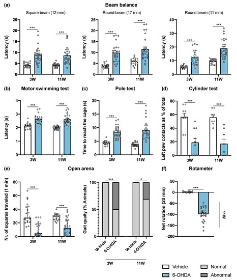 6-OHDA intrastriatal lesion effects on motor behavioral tasks. Overall, all performed tests were found to be sensitive to DA-depleting lesions of the nigrostriatal pathway, 3 and 11 weeks after intrastriatal 6-OHDA injections. 6-OHDA-lesioned mice presented significant impairments in general motor paradigms observed after beam balance (a), motor swimming (b) and pole (c) tests evaluation. The cylinder test (d) revealed that 6-OHDA animals use the left (lesioned) forelimb significantly less when compared to the vehicle group (Student’s t-test; statistical summary in Table S1; data are presented as mean ± SEM). At the open arena (e), it was observed that 6-OHDA injections had a negative impact on the horizontal exploratory activity and animal’s gait quality. The rotameter test (f) revealed the success of intrastriatal 6-OHDA lesions with the majority of animals displaying turning behavior after apomorphine administration (Mann–Whitney U test; statistical summary Table S1; data are presented as mean ± IQR). Vehicle n = 19–20, 6-OHDA n = 23–26; except for cylinder test—vehicle n = 8–9, 6-OHDA n = 8–10. * p < 0.05, *** p < 0.001. Abbreviations: 6-OHDA, 6-hydroxydopamine.