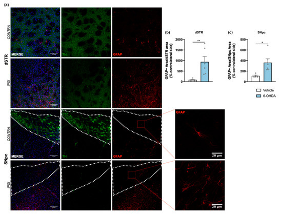 Astroglial reaction after 6-OHDA intrastriatal lesion. Confocal representative photomicrographs (a) showing labelling of DA neurons (green) and of astrocytic cells (red) from the dorsal striatum and SNpc, of contra- and ipsilateral sides of 6-OHDA-lesioned mice. Quantification of area coverage by GFAP+ staining showed a significant astrocytic reaction in the ipsilateral lesioned areas (b,c) of 6-OHDA mice. Area coverage was acquired from each 20× magnification image, and for SNpc, the area was delineated considering the dopaminergic neurons labelled for TH (Student’s t-test; statistical summary in Table S1; data are presented as mean ± SEM and as % of contralateral side). Vehicle n = 4–5, 6-OHDA n = 6–7 (four slices/animal). * p < 0.05, ** p < 0.01. Scale bars = 100 μm and 20 μm. Abbreviations: DA, dopamine; dSTR, dorsal striatum; GFAP, glial fibrillary acidic protein; SNpc, substantia nigra pars compacta; TH, tyrosine hydroxylase; 6-OHDA, 6-hydroxydopamine.