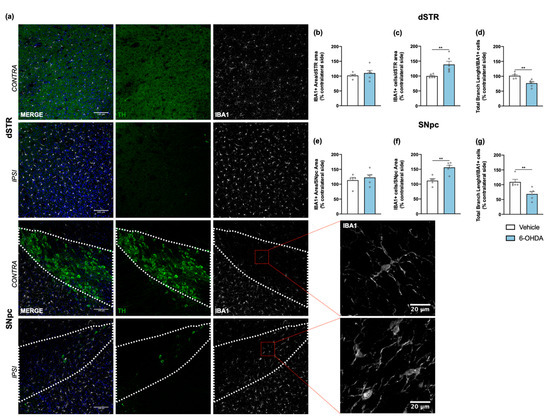 Microglial response after 6-OHDA intrastriatal lesion. Confocal representative photomicrographs (a) showing labelling of DA neurons (green) and of microglial cells (grey) from the dorsal striatum and SNpc, of contra- and ipsilateral sides of 6-OHDA-lesioned mice. No differences were found between groups after quantification of area coverage by IBA1+ staining in the dorsal striatum (b) and SNpc (e). A significant increase of IBA1+ cells (c,f), as well as a significant decrease of IBA1+ total branch length (d,g) in the ipsilateral areas of 6-OHDA group was observed, indicating the presence of proliferative and activated microglia. All measurements were performed in acquired 20× magnification images, and for SNpc, the area was delineated considering the dopaminergic neurons labelled for TH (Student’s t-test; statistical summary in Table S1; data are presented as mean ± SEM and as % of contralateral side). Vehicle n = 4–5, 6-OHDA n = 6–7 (four slices/animal). ** p < 0.01. Scale bars = 100 μm and 20 μm. Abbreviations: DA, dopamine; dSTR, dorsal striatum; SNpc, substantia nigra pars compacta; TH, tyrosine hydroxylase; 6-OHDA, 6-hydroxydopamine.