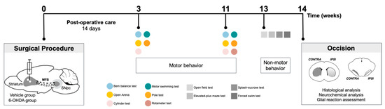 The sequence of the experiments carried out in this study is graphically outlined in Figure 6. Unilateral lesions in the dopaminergic system were achieved by injecting 6-OHDA at dorso-lateral striatum. Animals underwent surgical procedures for 6-OHDA lesions, and the degree of the lesion was assessed in a series of motor behavioral tests (balance beam, motor swimming test, pole test, spontaneous activity evaluation in open arena, cylinder test, and rotameter test). Behavioral assessment was performed 3 and 11 weeks after lesion surgery to evaluate possible progression of the lesion along time. In the last time-point of analysis, the open field, elevated plus maze, forced-swim test, and sucrose splash test were also conducted to identify the presence of non-motor symptoms in this model. At the end of behavioral assessment, animals were oscised, and brains dissected and processed for TH histological analysis, neurochemical analysis, and evaluation of glial reaction in lesioned areas (these data were analyzed under blinded conditions). In this study, the experimental groups have both males and females, since differences between sexes in terms of motor behavioral phenotypes and histological analysis was not observed (see Supplementary Materials, Figure S3 and Table S2).