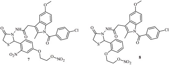 Sava et al. conducted synthesis of thiazolidin-4-one-indometacin hybrids and evaluated their antioxidant activity with use of DPPH radical scavenging method [21]. The most active derivatives from whole series were Compounds 7 and 8 with IC50 values 0.54 ± 0.01 and 1.82 ± 0.05 mM, respectively (Figure 3). Moreover, vitamin C equivalent antioxidant capacity (CEAC) value was determined. The CEAC value show how many times tested compounds are more active than vitamin C. All tested compounds were less active than vitamin C used as positive control. The most potent derivative was Compound 7 with the CEAC value 0.137 ± 0.01 vs 1 for vitamin C. Furthermore, Compound 7 revealed around 100-fold more activity than indometacin (CEAC value 0.0014 ± 0.0002).