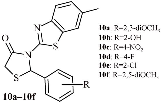 Shetty et al. synthesized thiazolidin-4-one-benzothiazole hybrids (10a–10f) and conducted their evaluation for antioxidant activity (Figure 5) [23]. For evaluation of antioxidant activity three different models (DPPH, nitric oxide and superoxide anion radical scavenging assays) were used. The most effective compound was Derivative 10d with IC50 values of 30.9 µg/mL (DPPH), 33.82 µg/mL (NO) and 31.88 µg/mL (Superoxide anion). However, these concentrations were higher than those for ascorbic acid used as standard (IC50 values in the range of 24.99–25.73 µg/mL).