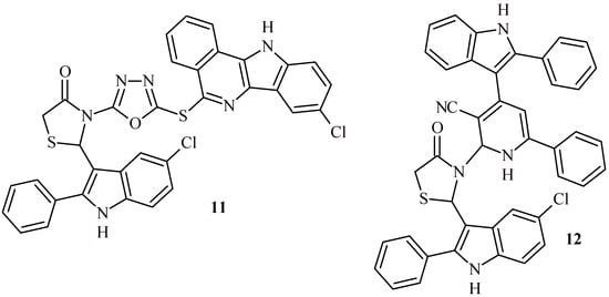 Verma et al. reported that Compound 11 (Figure 7) demonstrated excellent radical scavenging activity (78.83% of inhibition at concentration 100 µg/mL). The evaluation was carried out by the DPPH test [25]. Compound 12 with indolyl-pyridine moiety in structure showed more potent radical scavenging activity than 11 (80.89%, 86.02%, 89.86% and 92.05 % at concentration 25, 50, 75 and 100 µg/mL, respectively) [26].