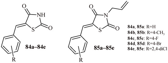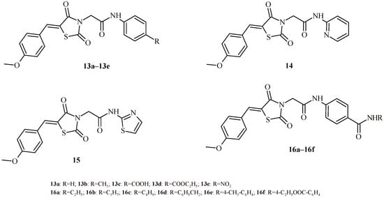 The 5-(4-Methoxybenzylidene)thiazolidin-2,4-dione derivatives (13a–13e, 14, 15 and 16a–16f) were tested for their activity against the HepG2, HCT116 and MCF-7 cell lines [30,31]. Among all tested derivatives (Figure 8), Compounds 16f, 16e, 16d and 16c showed the highest antiproliferative activity in the in vitro studies against HepG2, HCT116 and MCF-7 cell lines. Their IC50 values were in the range of 5.1–22.08 µM. Compound 16f showed most potent activity. It inhibited proliferation of HepG2 (IC50 = 6.19 ± 0.50 µM) and MCF-7 (IC50 = 5.10 ± 0.40 µM) cells better than reference drugs sorafenib (IC50 = 9.18 ± 0.60 µM for HepG2 and IC50 = 7.26 ± 0.30 µM for MCF-7) and doxorubicin (IC50 = 7.94 ± 0.60 µM and IC50 = 6.75 ± 0.40 µM for HepG2 and MCF-7, respectively). Derivative 16f exhibited also activity against HCT116 comparable to doxorubicin (8.37 ± 0.70 µM vs. 8.07 ± 0.80 µM). All the obtained derivatives were tested for inhibitory activity against the vascular endothelial growth factor receptor-2 (VEGFR-2). Among them Compound 16f exhibited most potent inhibitory activity with IC50 value 0.12 ± 0.02 µM that was comparable with results for reference drug sorafenib (IC50 = 0.10 ± 0.02 µM). Moreover, Compounds 16e, 16d, 16c and 16b showed also high potential towards VEGFR-2 with IC50 values 0.13 ± 0.02, 0.14 ± 0.02, 0.14 ± 0.02 and 0.18 ± 0.03 µM, correspondingly.
