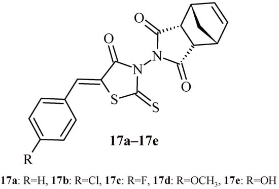 Studies carried out by Isogawa et al. showed that the rhodanine Derivative 17c (with 4-fluorobenzylidene substituent) strongly inhibited the melanogenesis process in mouse melanoma B16F10 cells in 10 µM concentration (Figure 9) [33]. Compound 17c reduced the level of tyrosinase activity without modifying its messenger RNA levels or enzymatic activity. This derivative may promote the degradation of tyrosinase proteins; however, this degradation may be associated with simultaneous protein synthesis. Taking this into account, it was found that the Compound 17a also lowered the activity level of the tyrosinase proteins, while having no effect on tyrosinase related protein 1 (TYRP-1), another protein involved in the melanogenesis process. Compound 17a (with benzylidene substituent) promotes the breakdown of tyrosinase from TYRP-1 in B16F10 cells. In injured cells, tyrosinase is localized together with TYRP-1 in two regions—the peripheral and the nuclear. The Compound 17a amplified the peri-nuclear signals while reducing the frequency of the peripheral signals. Other rhodanine Derivatives 17b (with 4-chlorobenzylidene substituent), 17d (with 4-methoxybenzylidene substituent) and 17e (with 4-hydroxybenzylidene substituent) were less effective than Compound 17c.