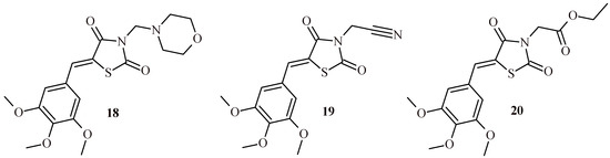 In a 2020, El-Kashef et al. synthesized series of TZD derivatives with 5-(3,4,5-trimethoxybenzylidene) moiety (Figure 10). The synthesized TZDs were tested for their anti-breast cancer activity against human breast cancer cells (MCF-7 and MDA-MB-231) and also against normal non-cancerous breast cells that were obtained from the same patients [35]. Initial screening studies showed that Compounds 18, 19 and 20 had the greatest anticancer activity. These derivatives inhibited the proliferation of breast cancer cells in a dose-dependent manner with an IC50 of 1.27, 1.50 and 1.31μM respectively. Using flow cytometric analysis, it was found that these three compounds mediated apoptosis of human breast cancer cells without affecting the survival of normal non-cancerous breast cells that had been isolated from the same patients. These compounds (18, 19 and 20) strongly inhibited the proliferation of MCF-7 breast cancer cells by reducing the phosphorylation of AKT, mTOR and expression of VEGF and HIF-1α.