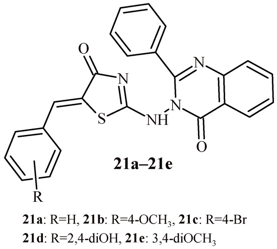 Aziz et al. conducted the synthesis of series quinazolinone-thiazolidin-4-one hybrids (21a–21e) and evaluated their anticancer activity against breast cancer (MCF-7) and lung cancer (A549) cell lines (Figure 11). Additionally, EGFR inhibitory activity of synthesized compounds was carried out [36].