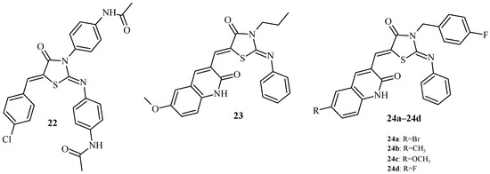 Kumar et al. conducted evaluation of anti-breast cancer activity of series of quinolinone-thiazolidin-4-one hybrids with use of MTT test on MCF-7 and MDA-MB-231 cell lines. As a result of the study, it was found that Compounds 23, 24a–24d were most potent in the series. Compound 24b showed the best activity against MDA-MB-231 cell line (IC50 = 8.16 µM), meanwhile Compound 24c was most effective against MCF-7 cancer cells (IC50 = 18.03 µM) (Table 2). It is worth noticing that Compounds 23 and 24a–24d had low cytotoxicity towards HEK-293 cells [38].