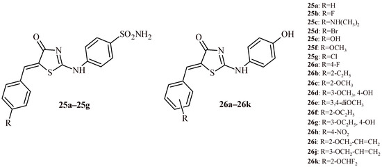 In the next study the evaluation of 5-arylidene-2-phenylaminothiazol-4(5H)-ones against ten leukemia cell lines (four Ba/F3 cell lines, KBM7-SLF N233, KBM7_WT, Dami, HL-60, Jurkat and K-562) was presented. The Compounds 26a–26k showed antiproliferative activity in submicromolar concentration at least for one cell line. The Compound 26c showed strong cytotoxic activity against three Ba/F3 cell lines at IC50 values in the range of 0.10–0.24 µM and against Dami cell line (IC50 = 0.87 µM). The Compound 26i, with 2-allyloxy substituent, possessed the highest antileukemic activity against Dami, HL-60, Jurkat and K-562 cell lines at submicromolar concentration 0.95, 0.17, 0.10 and 0.18, respectively [40].