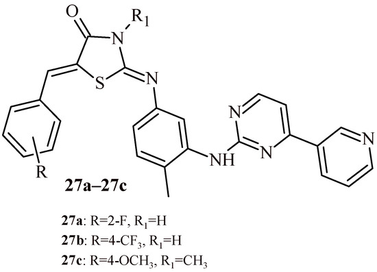 Türe et al. described synthesis of thiazolidine-4-one-phenylaminopyrimidine hybrids and tested them for their anticancer activity against chronic myeloid leukemia (K-562), prostate cancer (PC3) and neuroblastoma (SHSY-5Y) cells. Only three compounds (27a–27c) among the series of 42 hybrids showed cell viability% values less than 50.0% on K562 cells (Figure 14). The IC50 against K-562 cell line was also determined for these three compounds. The IC50 was 8.79, 4.86 and 9.97 µM, respectively for Compounds 27a, 27b and 27c. Additionally apoptosis studies, cell cycle experiments were carried out for 27a–27c. As a results, 27a and 27b cause mainly early and late apoptosis in K-562 cells in a time-dependent manner. In the cell cycle assay, Compounds 27b and 27c arrest G0/G1 phase similar to imatinib (standard), 27a induces cell cycle arrest G2/M phase [41].