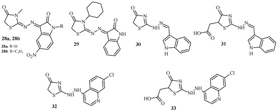 The series of isatin-based thiazolidin-4-one derivatives was synthesized and evaluated for their anticancer activity against three cancer cell lines (HepG2, MCF-7 and HT-29). The best activities among the series were found for Compounds 28a and 28b (Figure 15). The Compound 28a was active against HepG2, MCF-7 and HT-29 at half maximal inhibitory concentration of 27.59, 8.97 and 5.42 µM, respectively. While Compound 28b showed comparable activities to standard doxorubicin against all three cancer cell lines. The IC50 were 4.97 vs. 4.50 µM (HepG2), 5.33 vs. 4.17 µM (MCF-7) and 3.29 vs. 4.01 µM (HT-29). Moreover, these compounds showed satisfactory cytotoxicity against fibroblasts (WI-38) at concentration 98.22 µM (28a) and >100 µM (28b). Additionally, Compounds 28a and 28b were tested on inhibitory activity against CDK1, p53, caspase-3 and caspase-9. Compounds 28a and 28b exhibited comparable or more potent activity than doxorubicin used as standard (Table 3) [42].