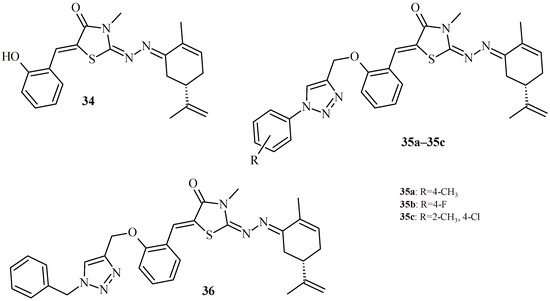 Oubella et al. described synthesis and evaluation of carvone-thiazolidin-4-one hybrids with 1,2,3-triazole moiety (34–36) for their anticancer activity against HT-1080, A-549, MCF-7 and MDA-MB-231 cell lines. As a result of the study, it was found that Compounds 35b and 35c (Figure 16) exhibited the most potent cytotoxic activity against HT-1080 and A-549 cell lines (Table 4). In the next step of the study, the cell death pathway of the cytotoxic activity of 35b and 35c was investigated. The results suggested that they are capable of inducing apoptosis in a caspase-3 pathway manner and to affecting the cell cycle [45].