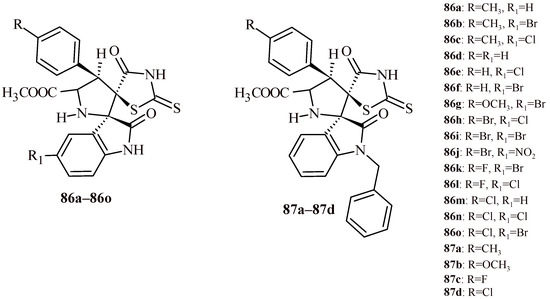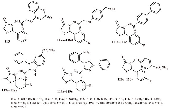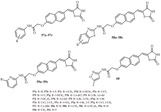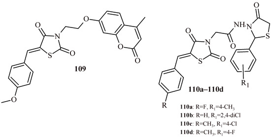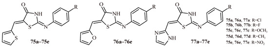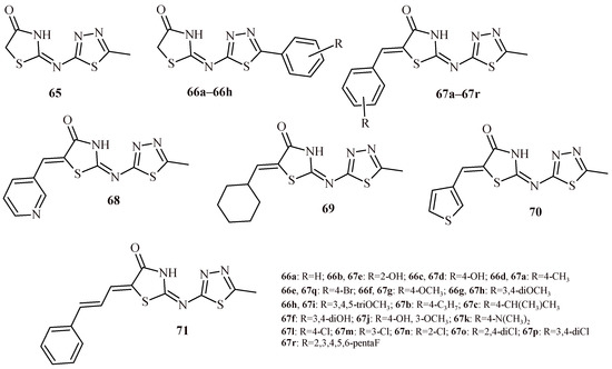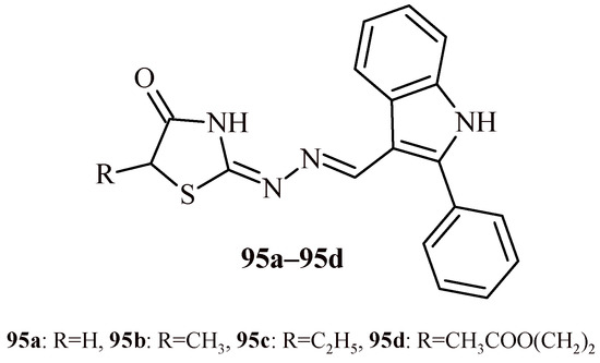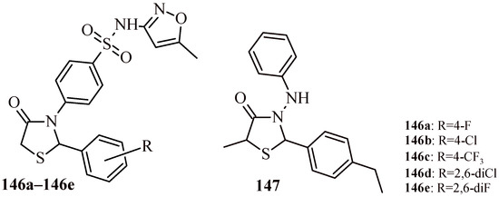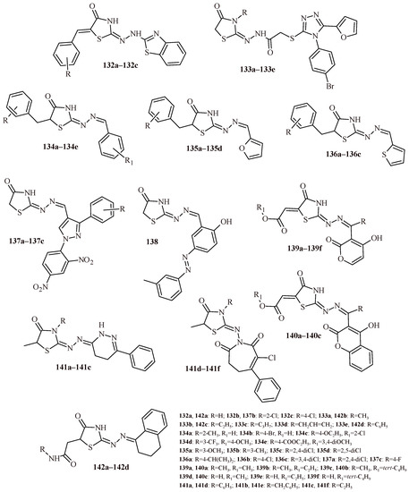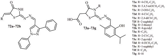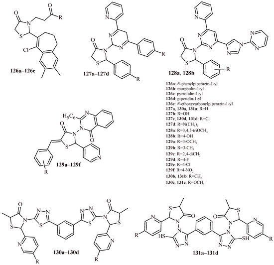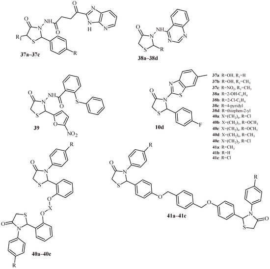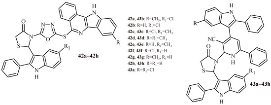 The structures of a series of thiazolidin-4-one-1,3,4-oxadiazoles (42a–42h) and thiazolidin-4-one with indolyl-pyridine moiety (43a–43h).