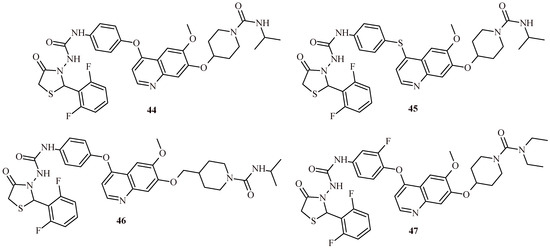 Zhou et al. described assessing of the quinoline-based 2-(2,6-difluorophenyl)-thiazolidin-4-one derivatives as kinase inhibitors for the treatment of colorectal cancer [50,51]. Among the fifteen derivatives, identified the most active Compound 44 showed cytotoxic activity against HT-29 cell line at IC50 value 0.31 ± 0.022 µM (Figure 19). Furthermore, 44 inhibited tyrosine-protein kinase Met (c-Met) and Ron tyrosine kinase in 65 and 84.4% with IC50 values 0.382 and 0.122 µM, respectively. The thio analogue of 44, Compound 45, showed slightly less activity against HT-29 cells (IC50 = 0.42 ± 0.031 µM), while maintaining a similar level of kinases inhibition (62.9%—c-Met; 83%—Ron). The homologue of 44, Compound 46, exhibited similar level of kinases inhibition (58.4% —c-Met; 86.1% —Ron) and cytotoxic effect against HT-29 cells (IC50 = 0.39 ± 0.028 µM). These results were more potent than same for standard drugs regorafenib (IC50 = 2.87 ± 0.18 µM against HT-29) and cabozantinib (IC50 = 10.6 ± 1.12 µM against HT-29) [50].