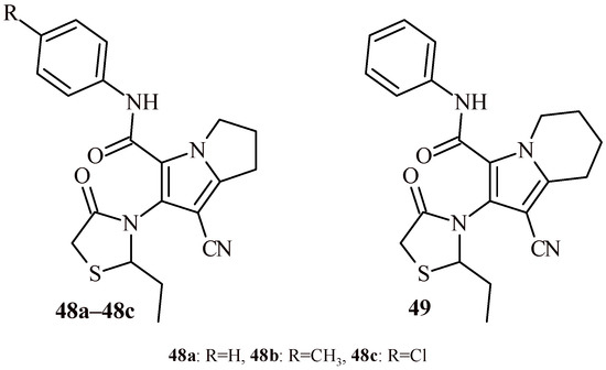 Iqbal and co-worker reported anticancer activity for Compounds 37a–37c as most effective among the series of imidazopyridine-thiazolidin-4-one hybrids (Figure 17). The Compound 37a with para-hydroxy group was found most potent against MCF-7 and DU145 with IC50 values 3.2 and 6.8 µM, respectively. Whereas Compound 37b (5-methyl analogue of 37a) was most effective against A549 (IC50 = 8.4 µM). The nitro substituted derivative (37c) showed slightly less activity than 37b against A549 (IC50 = 9.9 µM). Worth noticing that Compounds 37a and 37b with para-hydroxy group showed additionally antioxidant activity in DPPH assay (EC50 values of 40.26 and 39.72 µM, correspondingly) comparable with ascorbic acid used as standard (EC50 = 35.62 µM) [46].