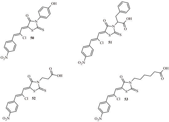 Hebishy et al. presented results of cytotoxic activity of bis-thiazolidin-4-ones (40a–40e and 41a–41c). In Table 5, results of compounds are presented. It shows the best activity of them against HepG2, MCF-7 and Caco-2. Compound 40a was the most effective against MCF-7 and Caco-2 cell lines with IC50 values of 22.04 and 45.91 µM, respectively. The Compound 40b was the most active against HepG2 cells (IC50 = 34.94 µM). Generally, ortho substituted derivatives (40a–40e) exhibited better cytotoxic activity than para derivatives (41a–41c) [49].