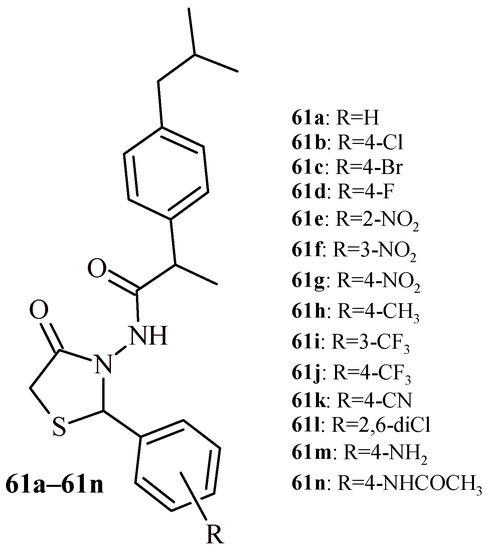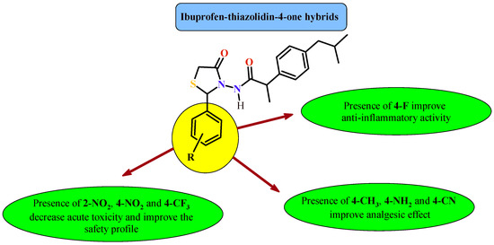 - Vasincu, I.-M.; Apotrosoaei, M.; Constantin, S.; Butnaru, M.; Vereştiuc, L.; Lupuşoru, C.-E.; Buron, F.; Routier, S.; Lupaşcu, D.; Tauşer, R.-G.; et al. New ibuprofen derivatives with thiazolidine-4-one scaffold with improved pharmaco-toxicological profile. BMC Pharmacol. Toxicol. 2021, 22, 10. [Google Scholar] [CrossRef]