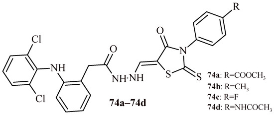 The Compounds 42g and 42h also expressed enhanced activity at half maximal inhibitory concentration of 1.54 and 1.82 µM (MCF-7), 1.78 and 1.85 µM (A549), 1.56 and 1.80 µM (HeLa). The other compounds showed moderate effect (42a–42c) or were inactive (Compound 11, Figure 7) [25]. Similar results were obtained also for series of Compound 12 and 43a–43h (Figure 7 and Figure 18). The most effective Derivative 43d showed activity against three cell lines at concentration 0.45 µM (MCF-7), 0.53 µM (A549) and 0.52 µM (HeLa) [26].