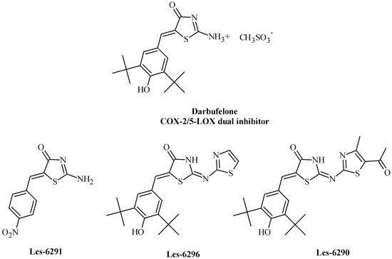 - Omar, Y.M.; Abdel-Moty, S.G.; Abdu-Allah, H.H.M. Further insight into the dual COX-2 and 15-LOX anti-inflammatory activity of 1,3,4-thiadiazole-thiazolidinone hybrids: The contribution of the substituents at 5th position is size dependent. Bioorg. Chem. 2020, 97, 103657. [Google Scholar] [CrossRef] [PubMed]