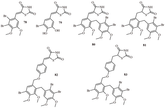 - Jiang, B.; Luo, J.; Guo, S.; Wang, L. Discovery of 5-(3-bromo-2-(2,3-dibromo-4,5-dimethoxybenzyl)-4,5- dimethoxybenzylidene)thiazolidine-2,4-dione as a novel potent protein tyrosine phosphatase 1B inhibitor with antidiabetic properties. Bioorg. Chem. 2021, 108, 104648. [Google Scholar] [CrossRef]