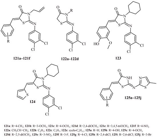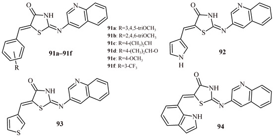 Whereas thiazolidin-4-one derivatives with indole (30, 31) and quinoline (32, 33) moieties showed weak antiproliferative effect against SF-295, HL-60 and PC3 cell lines. Their reduction of cell viability was less than 40.8% [44].