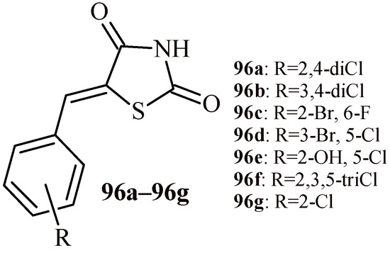 Another study contemplating on antioxidant activity of thiazolidine-2,4-dione (TZD) derivatives was published in 2020 by Kumar et al. [20]. The antioxidant activity of the 5-(-4-((substituted aryl/alkyl)methyl)benzylidene)thiazolidine-2,4-dione was assessed by applying DPPH radical scavenging method. Ascorbic acid was used as standard drug.