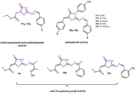 - Haroon, M.; De Barros Dias, M.C.H.; Da Silva Santos, A.C.; Pereira, V.R.A.; Barros Freitas, L.A.; Balbinot, R.B.; Kaplum, V.; Nakamura, C.V.; Alves, L.C.; Brayner, F.A.; et al. The design, synthesis, and in vitro trypanocidal and leishmanicidal activities of 1,3-thiazole and 4-thiazolidinone ester derivatives. RSC Adv. 2021, 11, 2487–2500. [Google Scholar] [CrossRef]