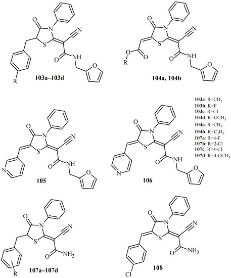 - Al-Behery, A.S.; Elberembally, K.M.; Eldawy, M.A. Synthesis, docking, and biological evaluation of thiazolidinone derivatives against hepatitis C virus genotype 4a. Med. Chem. Res. 2021, 30, 1151–1165. [Google Scholar] [CrossRef]