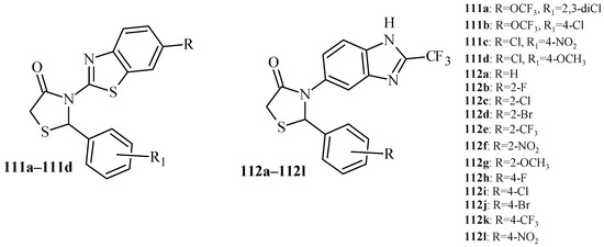 - Cheddie, A.; Shintre, S.A.; Bantho, A.; Mocktar, C.; Koorbanally, N.A. Synthesis and antibacterial activity of series of 2-trifluoromethylbenzimidazole-thiazolidinone derivatives. J. Heterocycl. Chem. 2020, 57, 299–307. [Google Scholar] [CrossRef]
