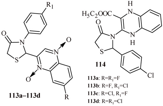 - Zhang, H.; Zhang, J.; Qu, W.; Xie, S.; Huang, L.; Chen, D.; Tao, Y.; Liu, Z.; Pan, Y.; Yuan, Z. Design, synthesis, and biological evaluation of novel thiazolidinone-containing quinoxaline-1,4-di-N-oxides as antimycobacterial and antifungal agents. Front. Chem. 2020, 8, 598. [Google Scholar] [CrossRef] [PubMed]