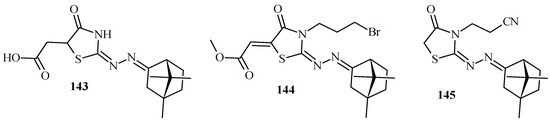 - Abo-Bakr, A.M.; Hassan, E.A.; Mahdy, A.H.S.; Zayed, S.E. Synthetic and biological studies on some new camphor thiazolidinones. J. Iran. Chem. Soc. 2021, 18, 2757–2769. [Google Scholar] [CrossRef]