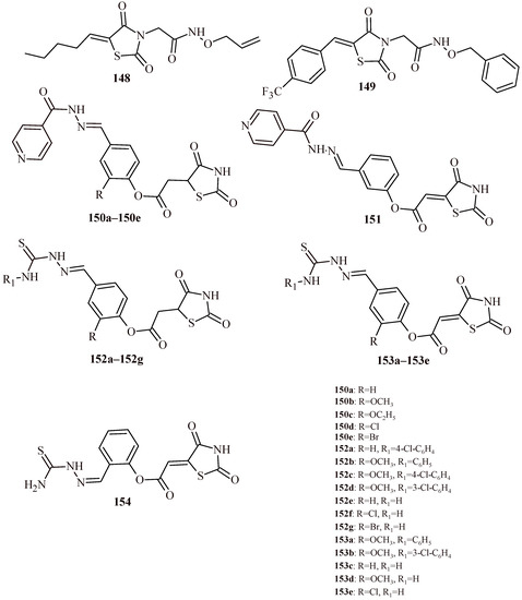- Patel, A.D.; Pasha, T.Y.; Lunagariya, P.; Shah, U.; Bhambharoliya, T.; Tripathi, R.K.P. A library of thiazolidin-4-one derivatives as protein tyrosine phosphatase 1B (PTP1B) inhibitors: An attempt to discover novel antidiabetic agents. ChemMedChem 2020, 15, 1229–1242. [Google Scholar] [CrossRef]