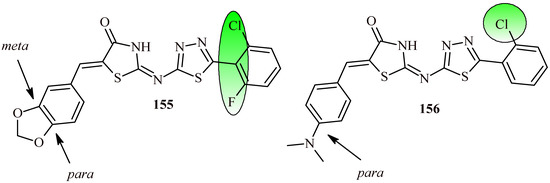 Abumelha and Saeed synthesized series of 5-arylidene-2-(4-acetamidophenylimino)thiazolidine-4-one derivatives and carried out their evaluation for anti-breast cancer activity (MCF-7) with use of MTT assay. Among series of ten compounds most active was Compound 22 (Figure 12). It showed half maximal inhibitory concentration at 58.33 µM. As a standard doxorubicin (IC50 = 48.06 µM) was used [37].