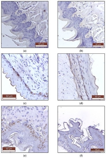 Immunohistochemistry—signals of Ki-67 and PCNA proliferation markers: (a) tongue mucosa—Ki-67, (b) tongue mucosa—PCNA, (c) esophagus mucosa—Ki-67, (d) esophagus mucosa—PCNA, (e) gastric keratinized mucosa—Ki-67, (f) gastric keratinized mucosa—PCNA.